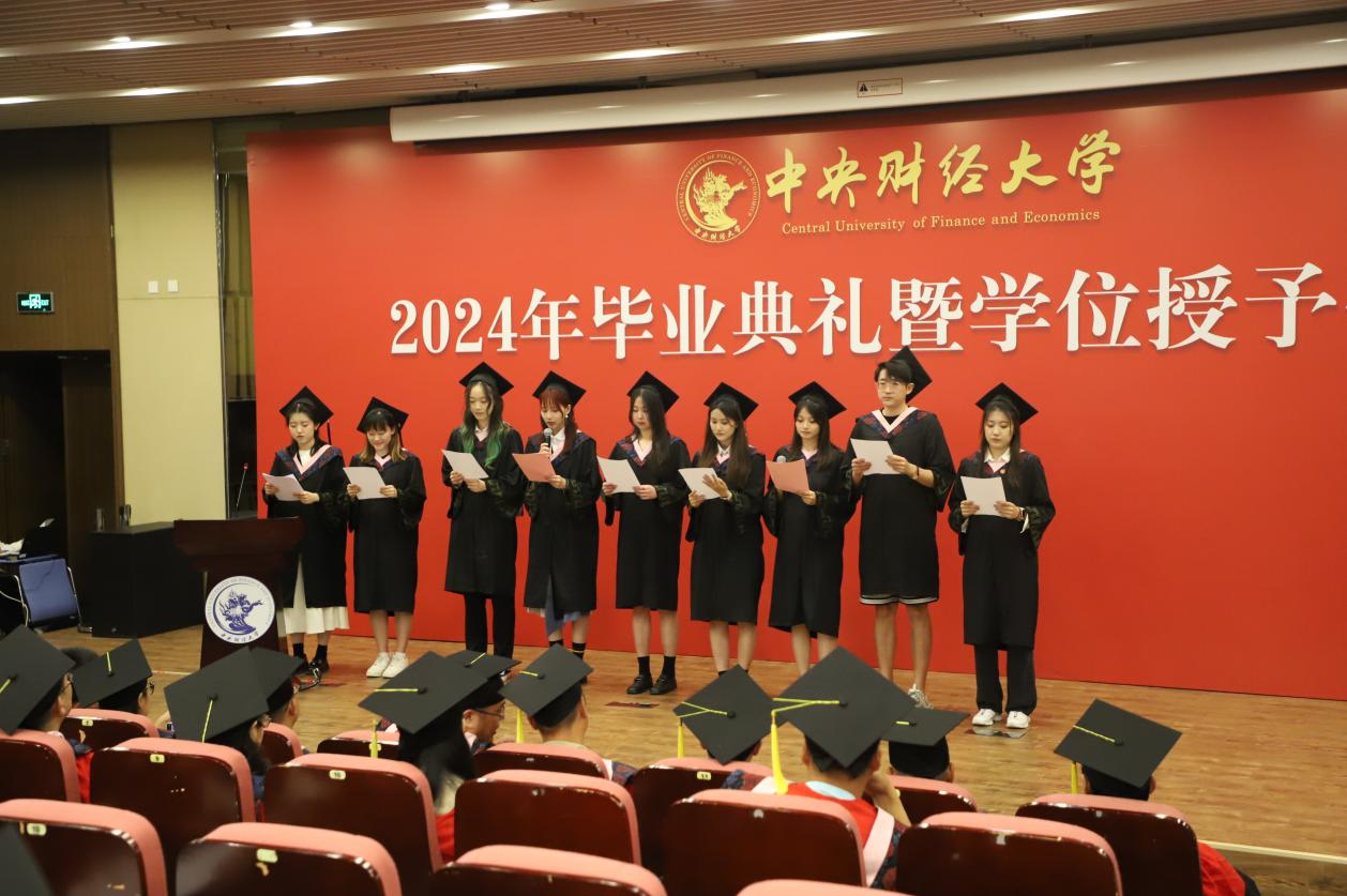 之后,典礼还进行了新校友接收仪式。学院校友分会副秘书长刘阳、郭佳佳为校友代表佩戴了校友徽章,并发放校友大礼包。毕业生从此多了一个身份——中财大校友!